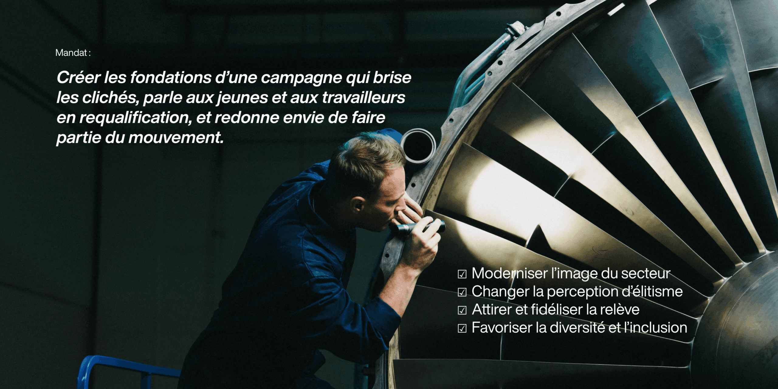 Celle de donner carte blanche à une équipe créative pour traduire la fierté d’une industrie qui, trop longtemps, a parlé de ses avions sans parler de son monde.